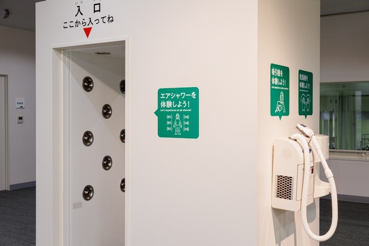工場の様子を見る前にまずは「毛髪粉じん除去」と「エアシャワー」の衛衛生管理システムを体験しました。